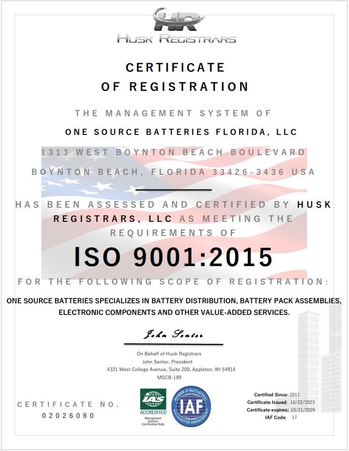 One Source Batteries is proud to announce that following our ISO 9001:2015 re-certification audit on August 5, 2024, we successfully passed and continue to maintain full certification.